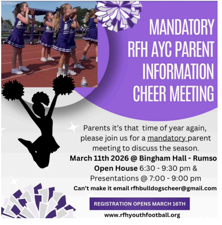 Mandatory parent meeting March 11! EMAIL FOR MORE INFO rfhbulldogscheer@gmail.com